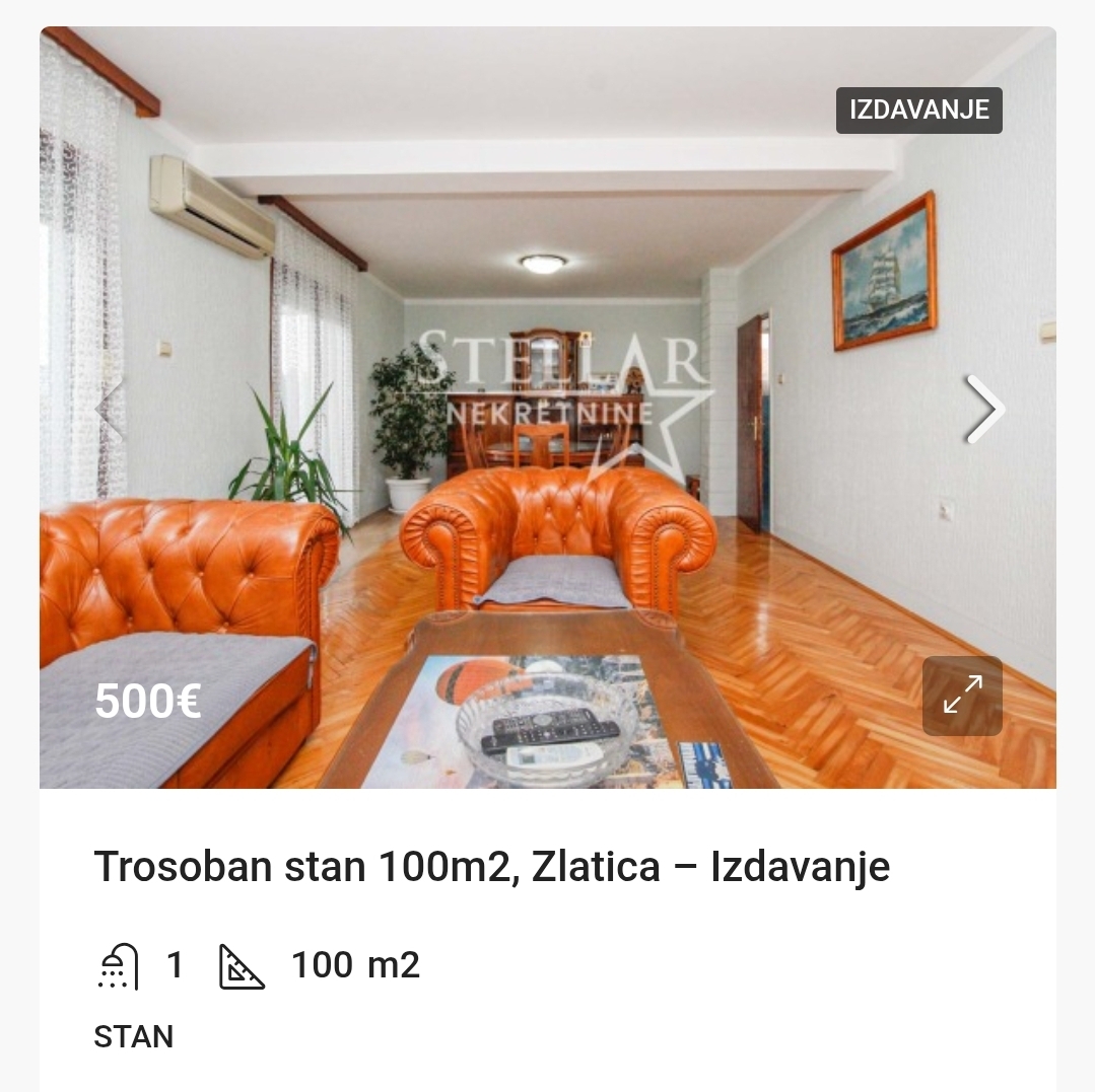 Opis: Three-room apartment for rent in Zlatica. The apartment has an area of 100m2 and is located on the first floor of the house.