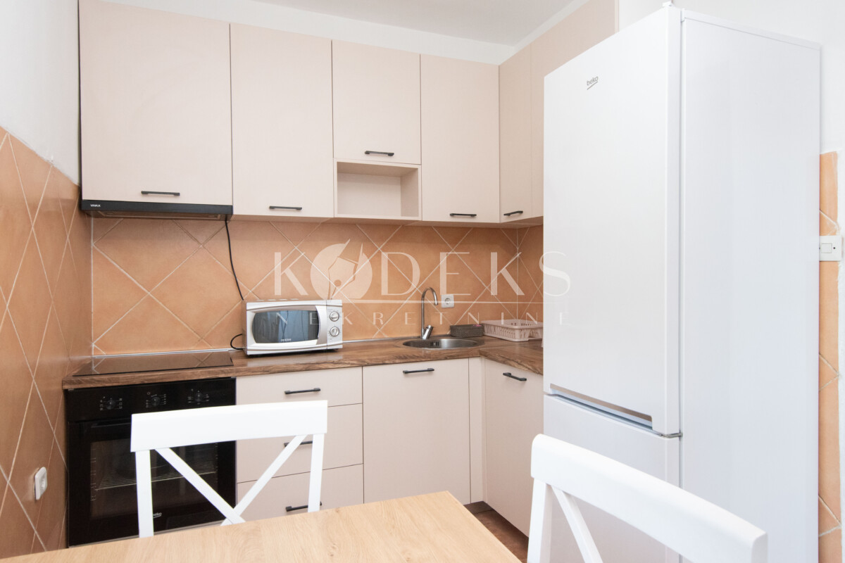 Struktura: Dnevna soba, odvojena trpezarija sa kuhinjom iz koje se izlazi na terasu, spavaća soba, ulazni hodnik i kupatilo.