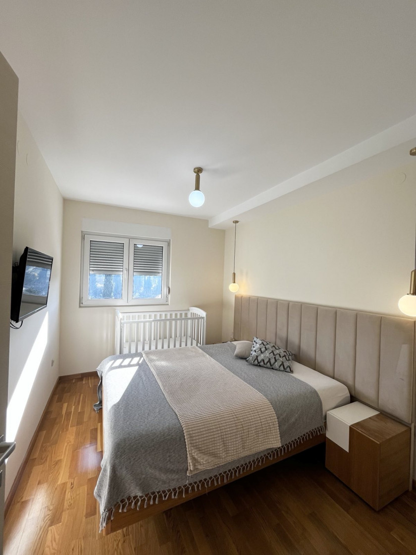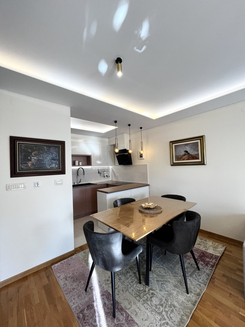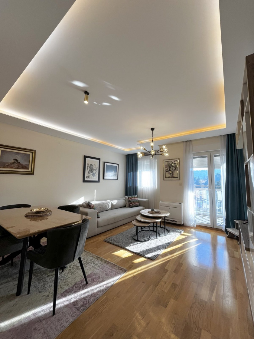 Opis: Prodaje se dvosoban luksuzno namješten stan površine 73m2 u novoj i kvalitetnoj zgradi Zetagradnje na samom početku Zagoriča. Stan je pozicioniran na četvrtom spratu, zgrada ima lift i redovno je održavana. Struktura stana: ulazni hodnik, dnevni boravak, odvojena kuhinja i trpezarija, predsoblje, dvije sšavaće sobe, kupatilo, toalet, vešeraj i terasa. Stan je opremljen stvarima vrhunskog kvaliteta, prodaje se sa cjelokupnim namještajem. Stan je vrhunskog rasporeda, ima dosta velike prostorije, a orjentisan je istočno. Ima ugrađen multisplit sistem grijanja i hlađenja što daje na dodatnoj vrijednosti. u cijenu ovog stana uračunata su i dva garažna mjesta koja se nalaze odmah pored lifta,jedno garažno mjesto je u tkzv boxu i može se preurediti u manju ostavu jer posjeduje 18m2, a drugo mjesto je 12m2. Nije obavezna kupovina oba parking mjesta, već je moguće kupiti samo jedno.