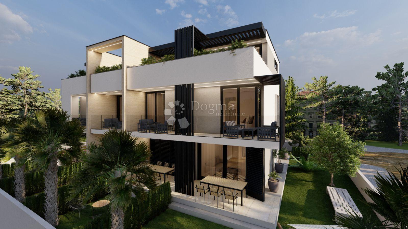 Smješten u apartmansku zgradu od 4 apartmana. Sastoji se od 3 spavaće sobe, otvorenog open space dnevnog boravka i blagovaonice, gostinskog wc-a te kupaonice. Prvi i drugi kat imaju izlaze na balkon, dok se u prizemlju iz dnevnih prostorija izlazi na terasu i dio vlastite okućnice.