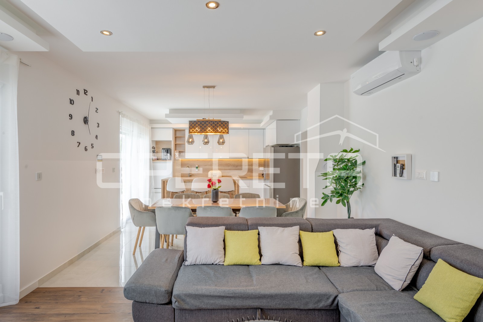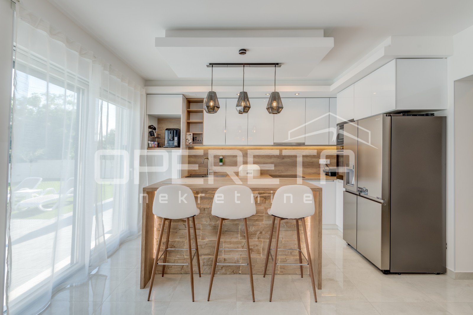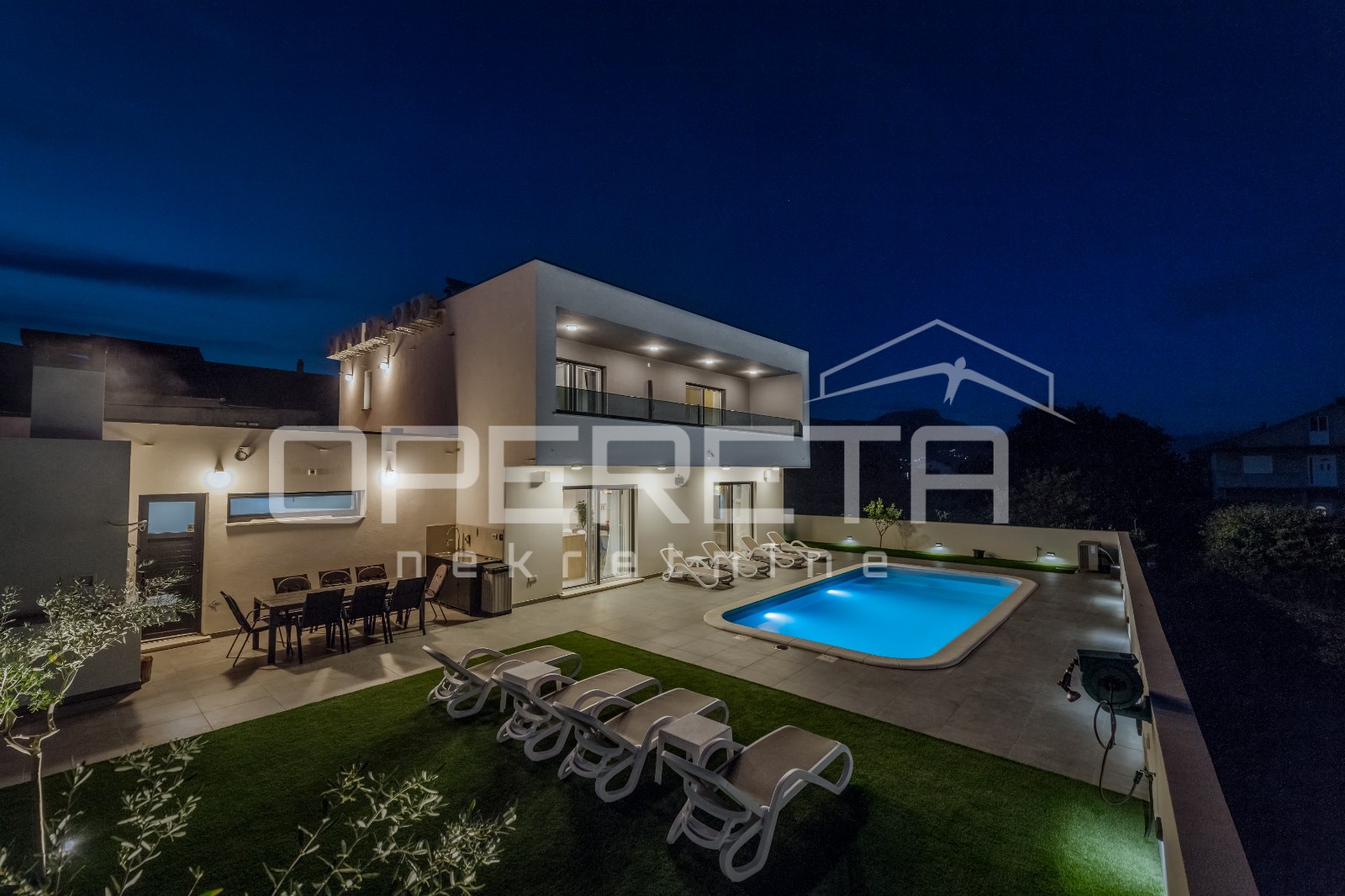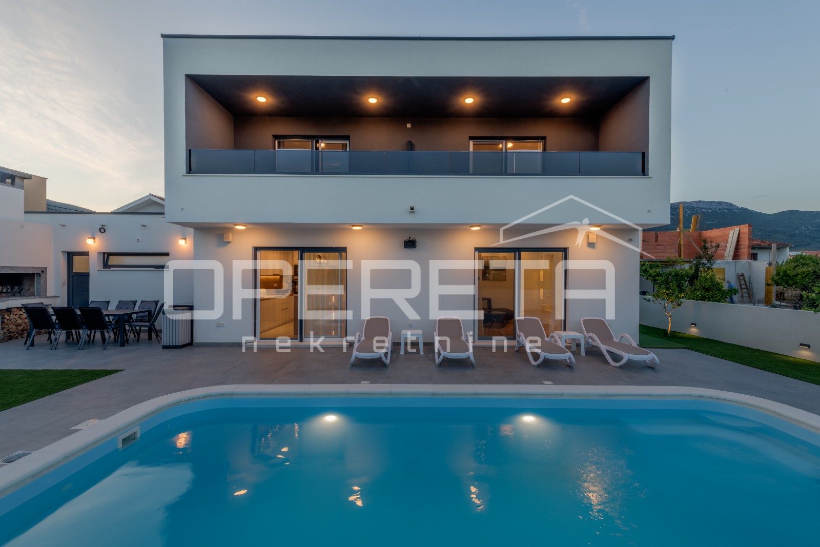 Opis: Novoizgrađena moderna vila s garažom i bazenom, Kaštel NoviOva suvremena vila, izgrađena 2025. godine, osmišljena kao obiteljska nekretnina koja jednako dobro funkcionira i u turističkoj namjeni, smjestila se u Kaštel Novom, na parceli od 517 m2.Vila obuhvaća visokokvalitetnu gradnju s raznim sadržajima, opremom i smislenim rasporedom.Kroz dvije etaže i svojih 181 m2 (202 m2 bruto površine) nalaze se 4 spavaće sobe, otvoreni dnevni boravak s kuhinjom i blagovaonicom, 2 kupaonice, odvojeni toalet, 2 spremišta, garderoba i vešeraj.Suvremen dizajn posebno dolazi do izražaja u dnevnom boravku sa širokim staklenim stijenama što pružaju mnogo sunčeve svjetlosti i povezuje sa stražnjim dvorištem. U tom dijelu uređenog dvorišta nalazi se bazen sa sunčalištem, ljetna kuhinja s velikim kamenim roštiljem te livadom koja pruža mogućnost za dodatne aktivnosti ili sadržaj. Bazen uz pomoć dizalice topline ima mogućnost grijanje ili hlađenje vode.U prednjem ulaznom dvorištu je osigurano parkiralište za 4 automobila, kao i garaža za 2 vozila....