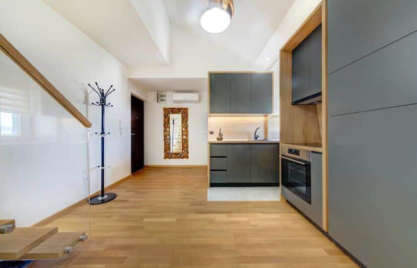 Opis: Moderan duplex u manjoj stambenoj zgradi, povrsine 45 m2, organizovan kao jednosoban stan nadomak centra, u Ul. Kralja Nikole u naselju Pobrezje, Podgorica.