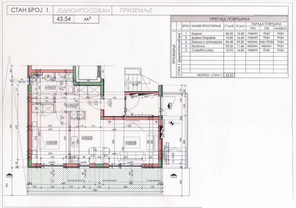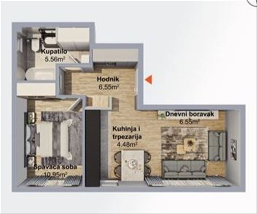 Prostorije: predsoblje, dnevni boravak sa kuhinjom, spavaća soba, kupatilo.