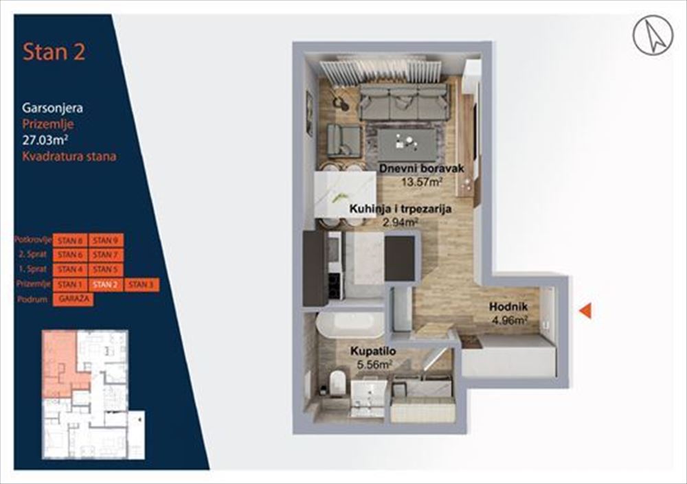 Opis: Odlična garsonjera u novogradnji na Lekinom brdu sa pripadajućom terasom od 50m2.