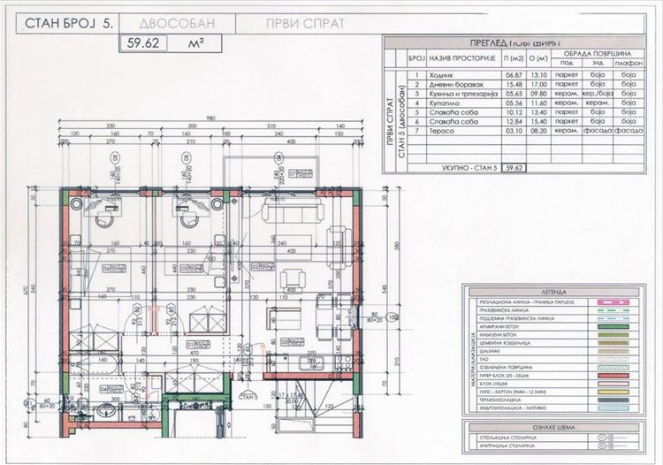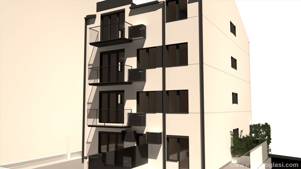 Prostorije: predsoblje, dnevni boravak, kuhinja, dve spavaće sobe, kupatilo, terasa.