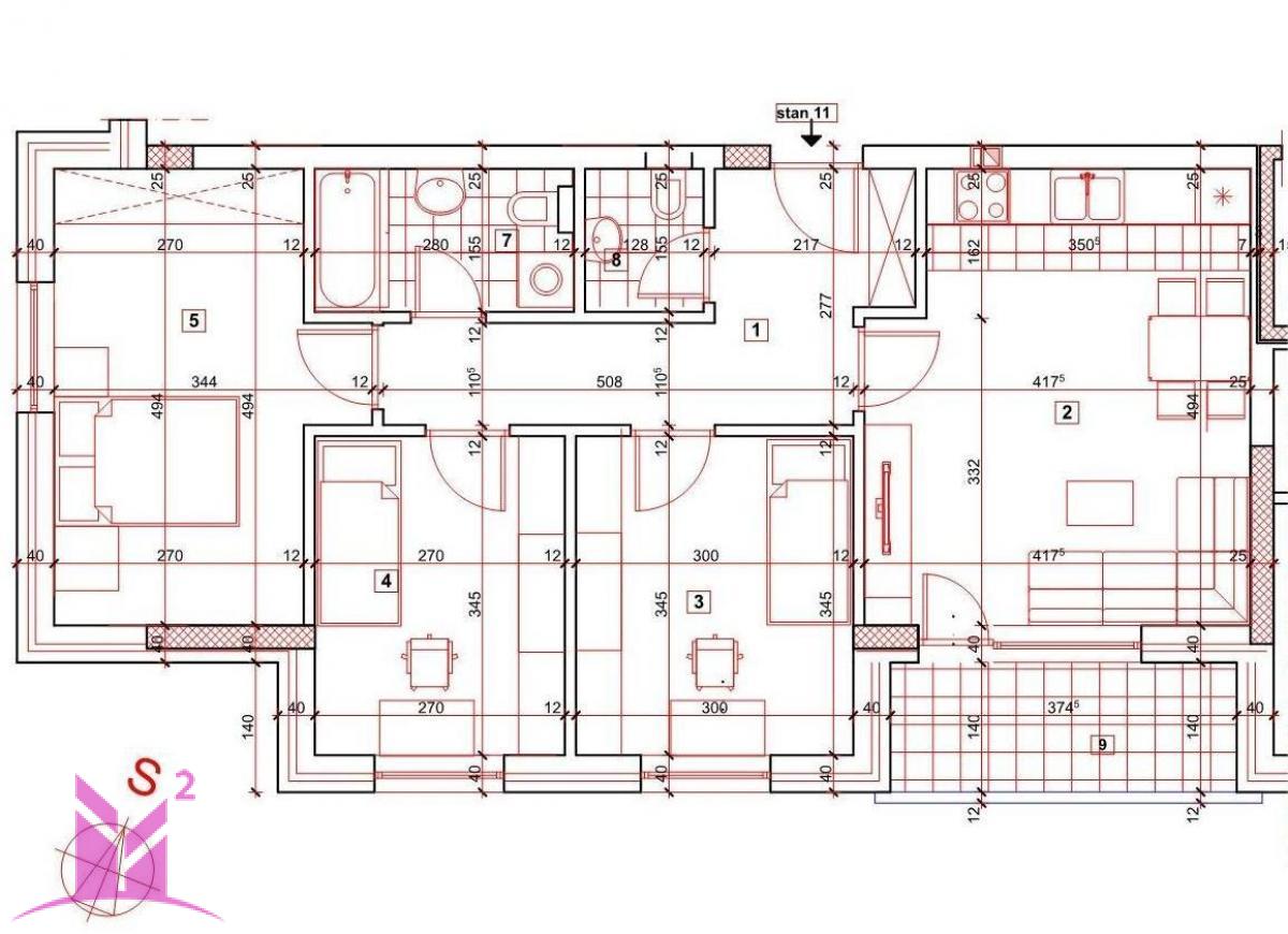 Stan se sastoji od 3 spavaće sobe (9-13m2), 2 mokra čvora, dnevne sobe koja je spojena sa kuhinjom i iz koje ima izlaz na terasu.
