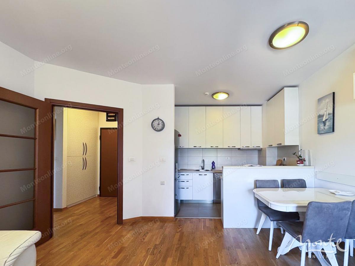 Raspored uključuje prostran ulazni hol, svijetao dnevni boravak u kombinaciji sa kuhinjom i trpezarijom, sa izlazom na terasu, dvije odvojene spavaće sobe, gostinjski toalet i kupatilo. Stan je u potpunosti opremljen svim potrebnim namještajem i aparatima i spreman je za odmah useljenje.