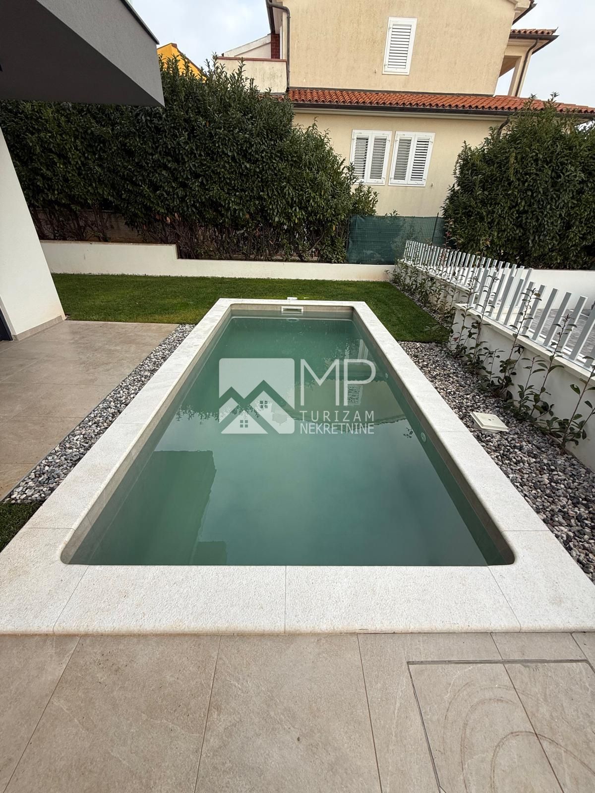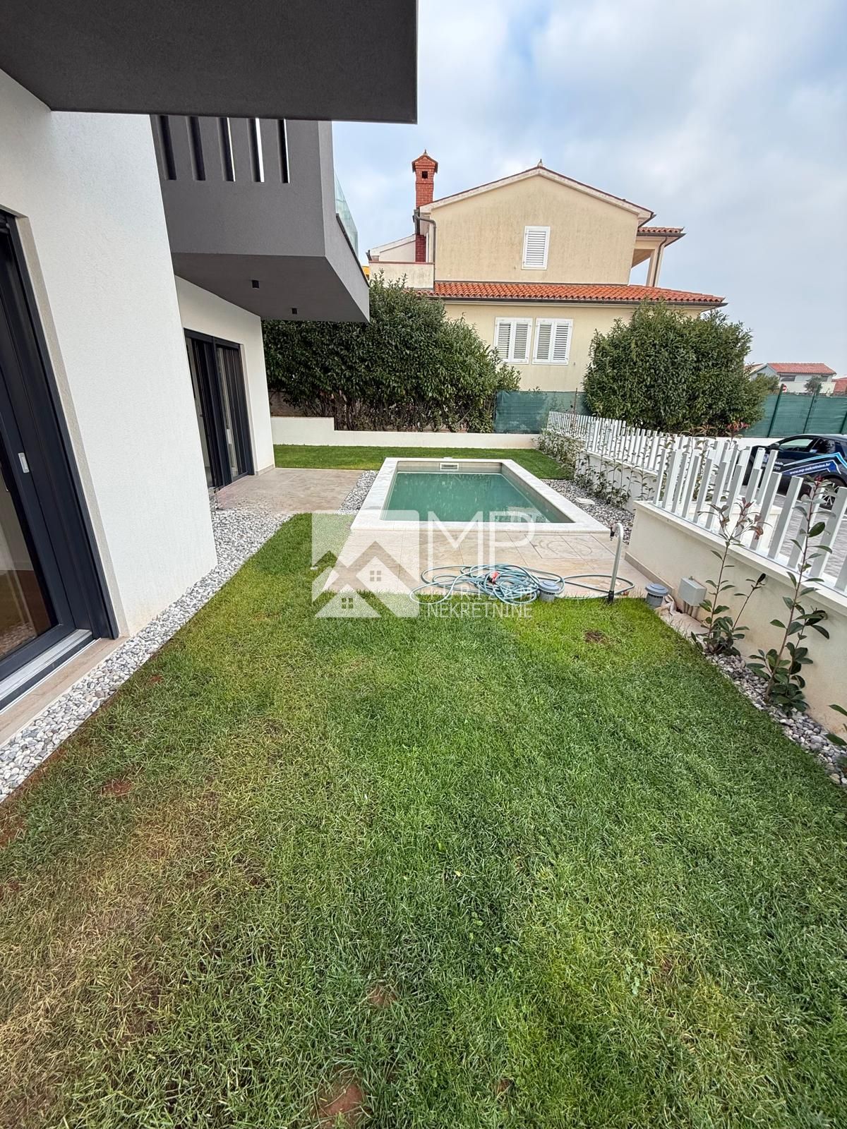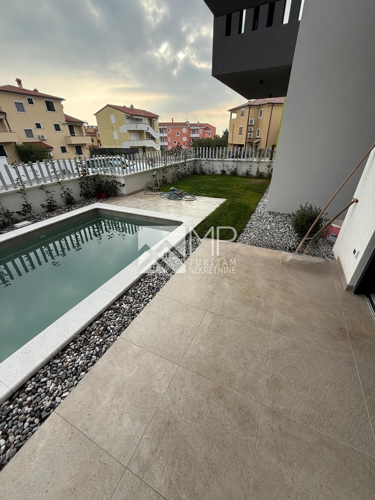 Vlastiti parking, vrt ( stanovi u prizemlju ), terasa, bazen ( stanovi u prizemlju ).