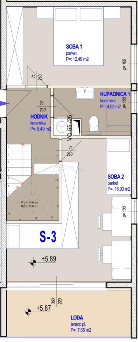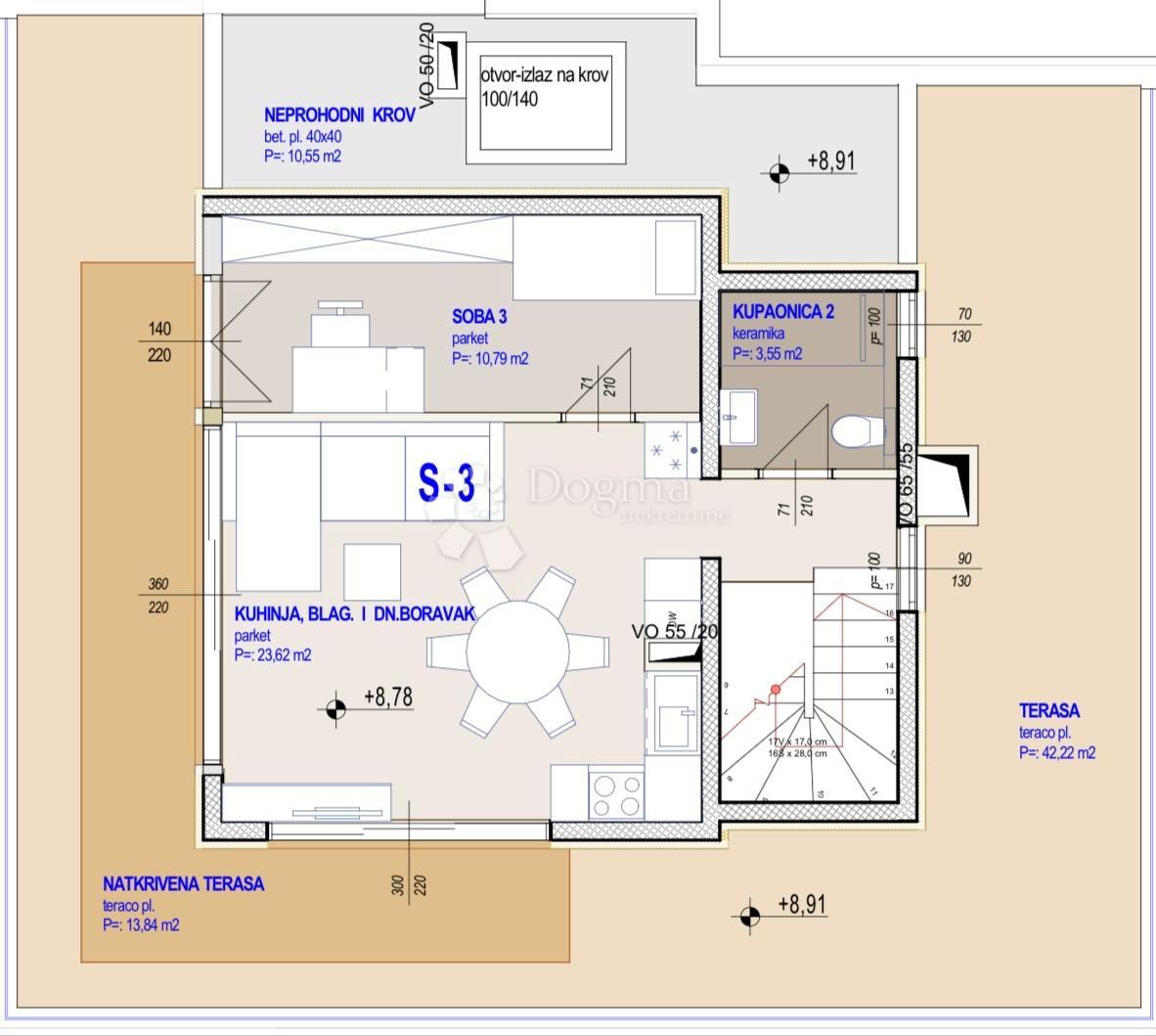 Na prodaju je prostrani i moderni dvoetažni trosobni stan S-3, smješten u novoj zgradi na izrazito poželjnjoj lokaciji u Kaštelima, svega 250 m od plaže. Okolica je mirna, a u neposrednoj blizini nalaze se svi sadržaji potrebni za svakodnevni život – dućani, ljekarne, kafići i škole.
