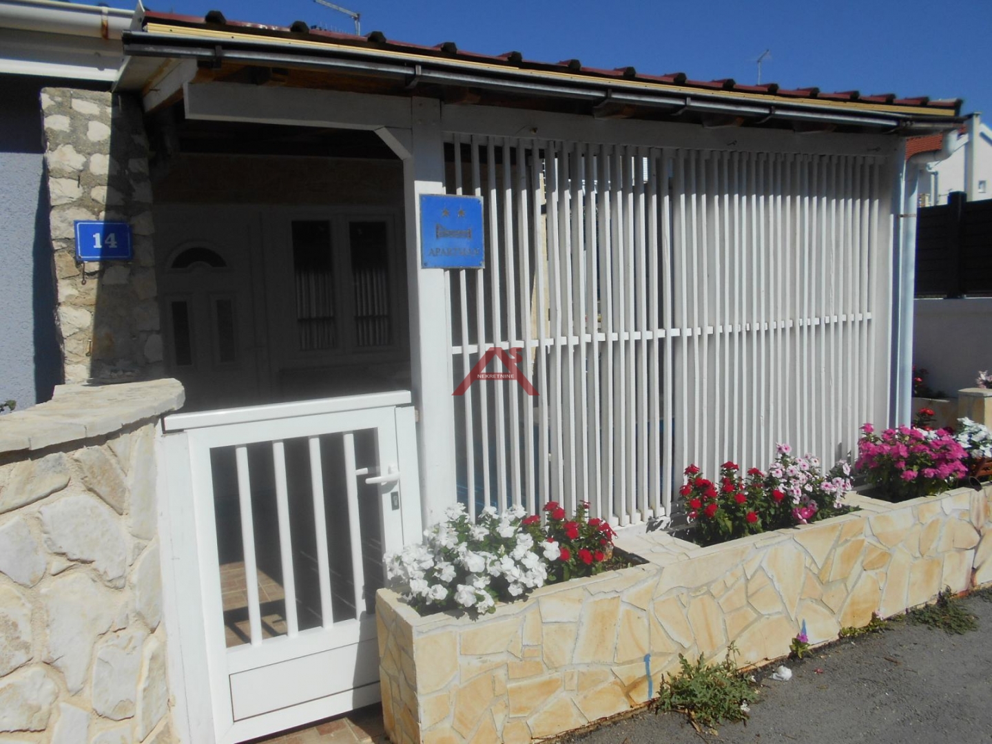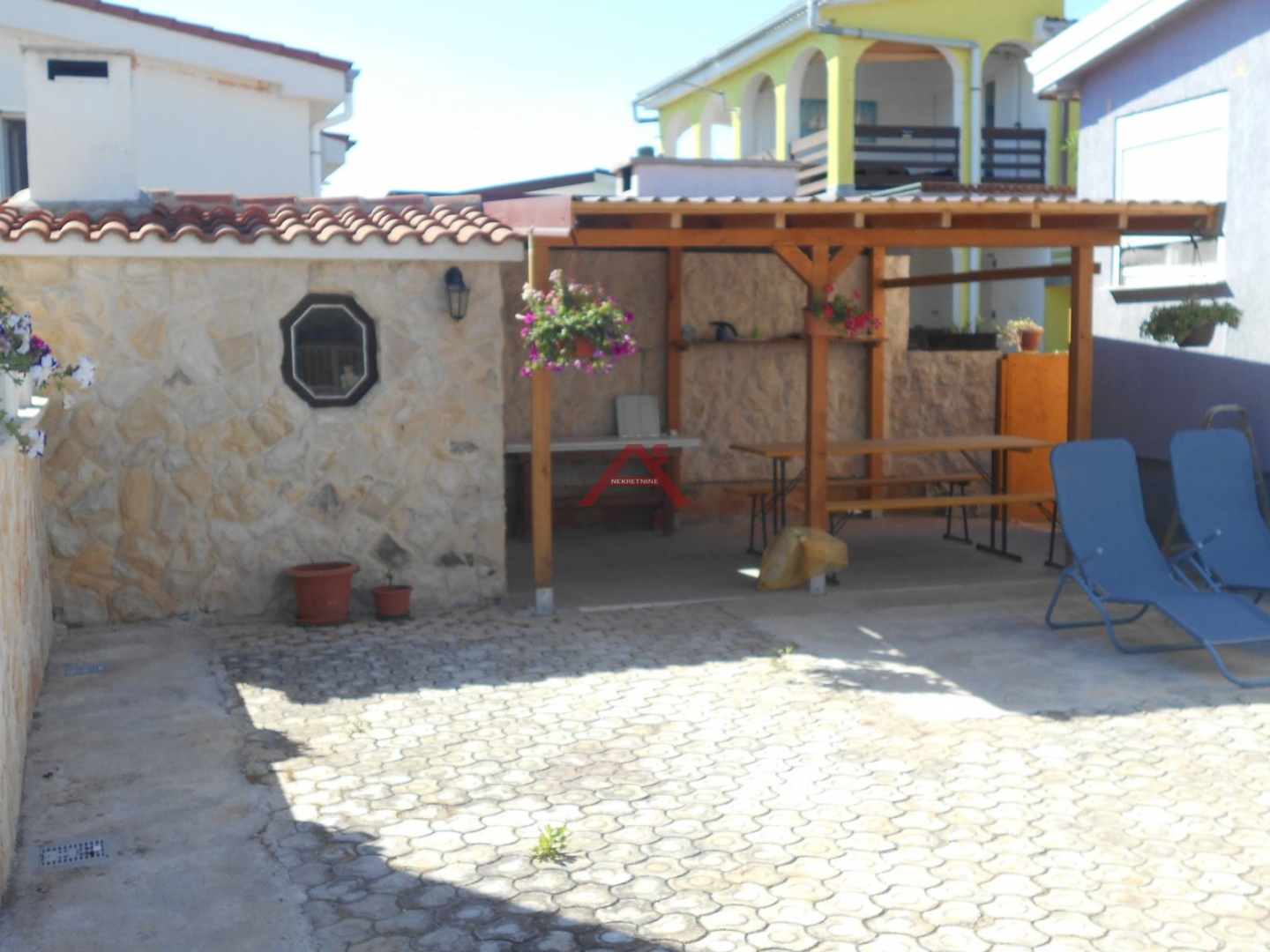 U kratko; Vir, južna strana, kuća sa 3 apartmana, 60 koraka do mora, gradski vodovod i kanalizacija, blizina trgovine, autobusne stanice, pekare, restorana, namještaj u cijeni.