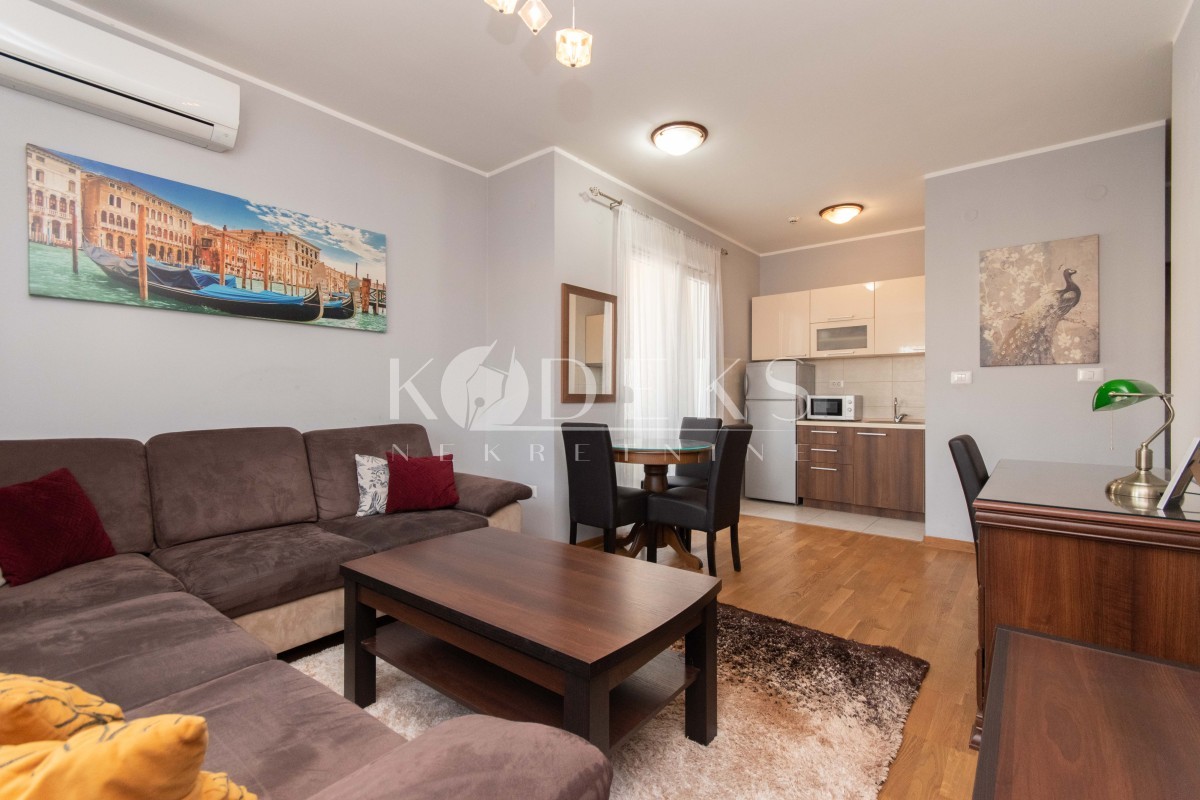 Opis: Izdaje se namješten jednosoban stan smješten na petom (nije posljednji) spratu stambene u Siti kvartu.