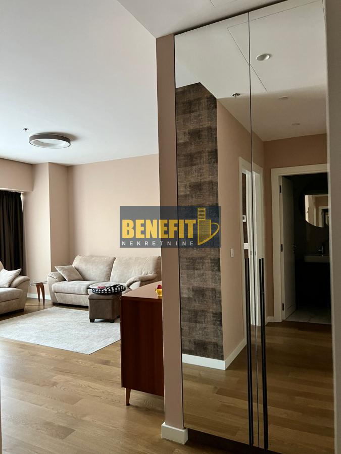 Opis: Stan se nalazi na jednoj od najekskluzivnijih lokacija u gradu, u Kuli West 65. U zgradu je omogućen ulazak samo pomoću kartice, a stanari mogu uživati u uslugama SPA centra sa bazenom dužine 20m, ispunjenim termalnom vodom, đakuzijem, turskim kupatilom, saunom, teretanom. Pored pomenutog SPA centra, tu je i frizersko-kozmetički salon, bioskop, kao i direktan pristup iz zgrade u mall.