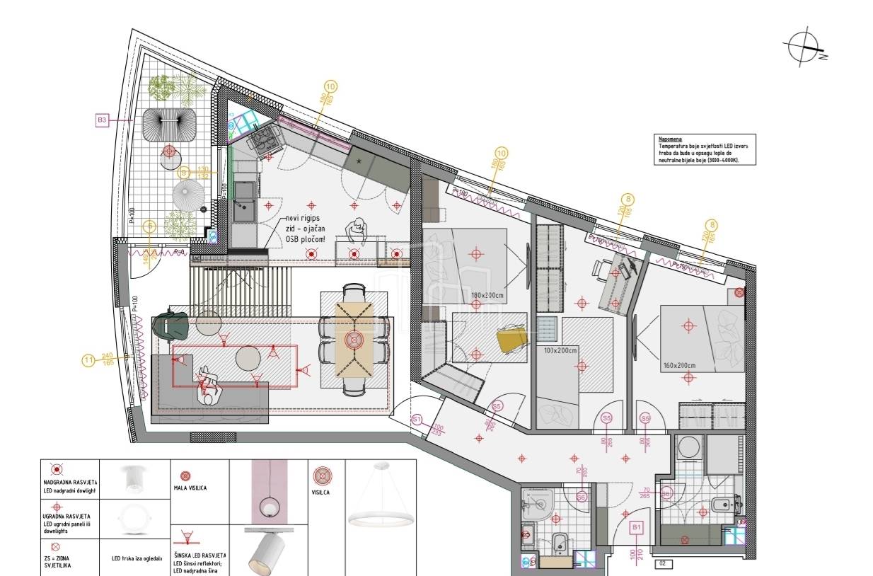 Jugozapadna orijentacija, sa tri spavaće sobe i velikim dnevnim boravkom te pogledom na čitav grad. Ima svoja parking mjesta u garaži.