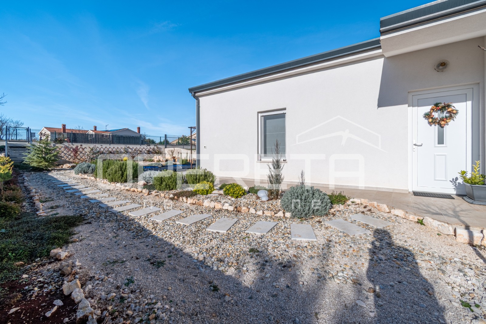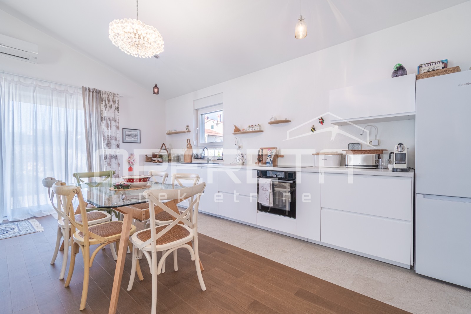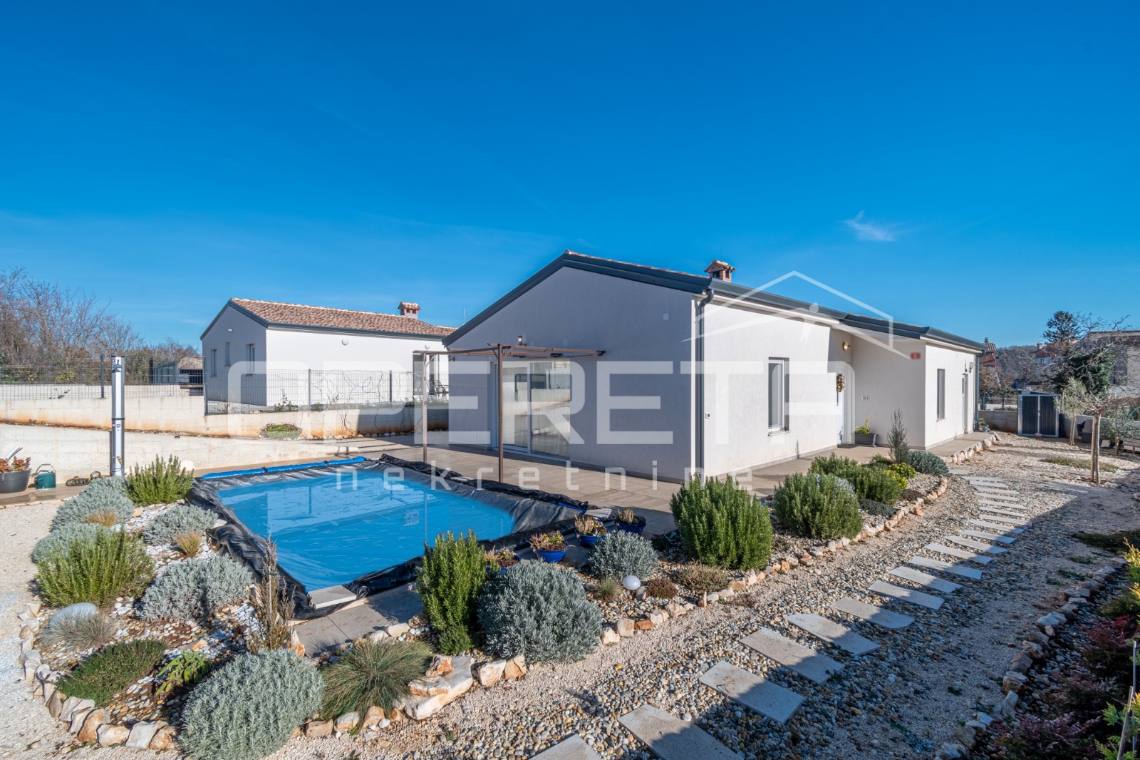 Opis: Na prodaju je ova moderna prizemnica smještena u Tinjanu.Kuća stambene površine 106 m2 nalazi se na lijepo uređenoj parceli od 590 m2, stvarajući ugodan prostor za boravak tijekom cijele godine. Ulaz vodi u prostrani hodnik kojim se dolazi u open space dnevno područje. Dnevni boravak, kuhinja i blagovaonica povezani su u skladnu cjelinu, ispunjenu prirodnim svjetlom i toplinom. Iz dnevnog dijela pruža se izlaz na natkrivenu terasu i bazen dimenzija 6 × 3 m, na kojem je dodatno izvedena priprema za ugradnju dizalice topline. Desna strana kuće rezervirana je za tri udobne spavaće sobe i dvije moderno uređene kupaonice, pri čemu obje kupaonice imaju podno grijanje. S vanjske strane kuće nalaze se spremište i mala ostava, praktični za sve potrebe domaćinstva. Kuća je opremljena sustavima grijanja i hlađenja putem klima uređaja, peći na drva te podnim grijanjem u kupaonicama, što osigurava ugodan boravak bez obzira na godišnje doba. U dvorištu se nalaze dva parkirna mjesta te lijepo uređen vrt koji upotpunjuje ambijent i osigurava mir i privatnost.