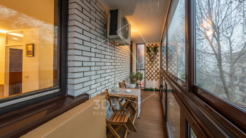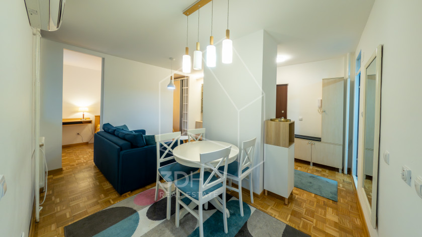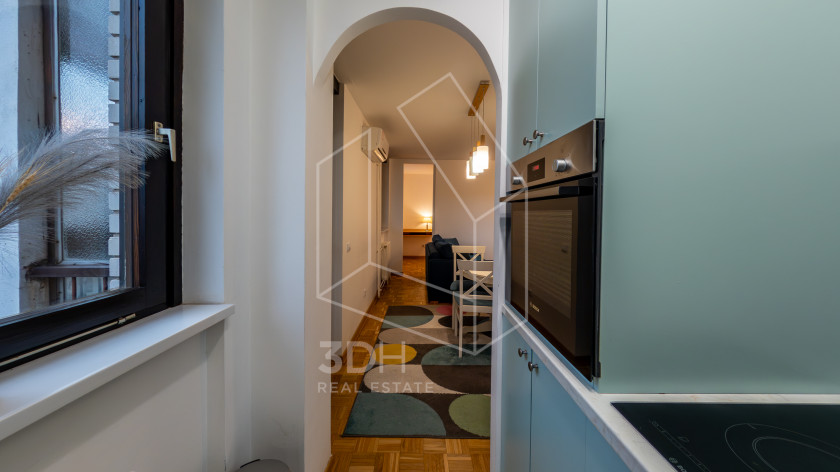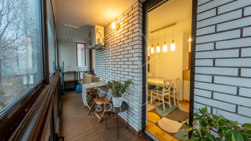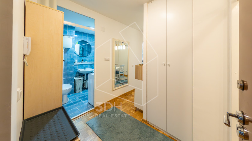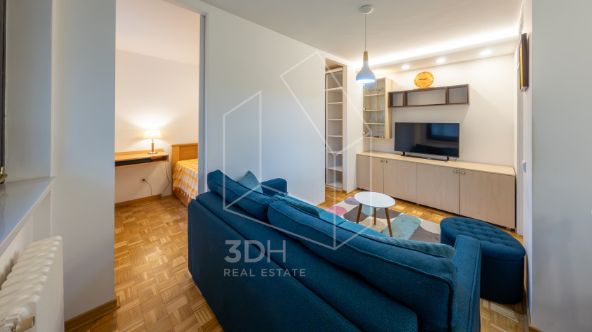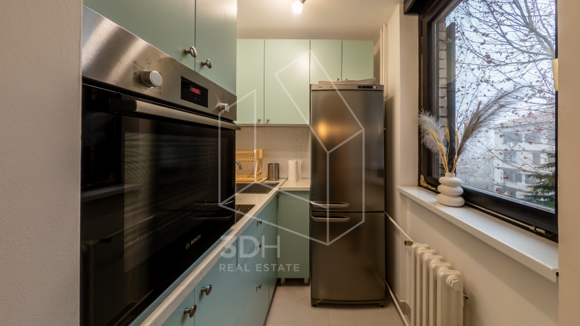 Stan je kompletno renoviran kvalitetno i funkcionalno, a kreativno i praktično opremljen. Koncipiran je kao “Open space” sa izdvojenom kuhinjom i kliznim vratima odvojivom spavaćom sobom. Nalazi se u zgradi koja je okružena parkovima i zelenilom, u mirnoj “slepoj” ulici kojom ne cirkuliše saobraćaj, zaklonjena od buke. Oko same zgrade je veliki broj parking mesta za stanare zgrade. Ulaz u zgradu je uredan i održavan. Stan ima komfornu zastakljenu terasu za uživanje površine 6m2.