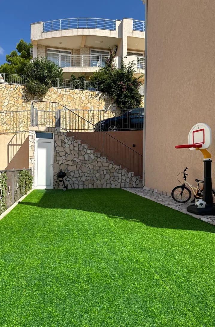 Proteže se na dva nivoa. U prizemlju je smješten veliki open space kojeg čini dnevni boravak sa kuhinjsko-trpezarijskim djelom, odakle se direktno izlazi na veliko dvorište sa kojeg se pruža pogled na more. Na ovom nivou se nalazi i veliko kupatilo sa tuš kabinom kao i vešernica/ostava.