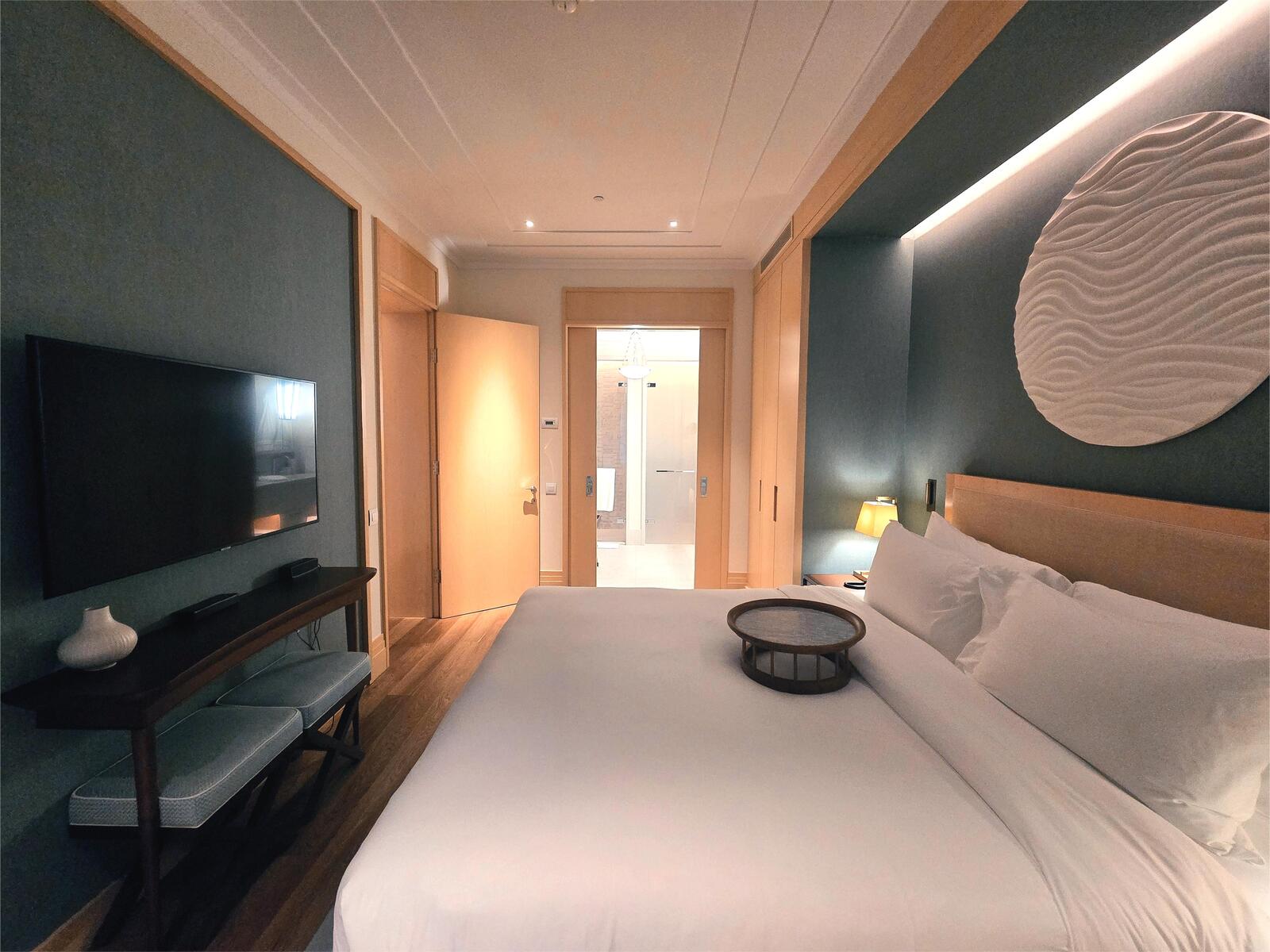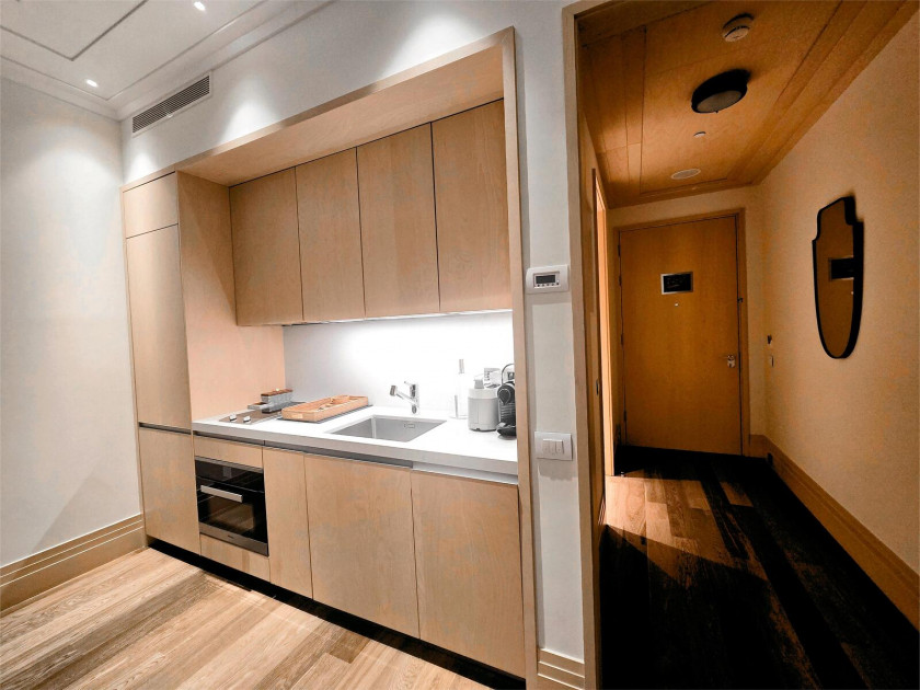 Unutarnja površina apartmana od 65,5 m² uključuje ulazni hodnik, gostinjski WC, otvoreni dnevni boravak s kaminom, blagovaonicu i kuhinju opremljenu Miele aparatima, kao i spavaću sobu s vlastitom kupaonicom (kada i tuš). Terasa od 32,9 m² gleda na bazene Regent Pool Club i ima djelomičan pogled na more.