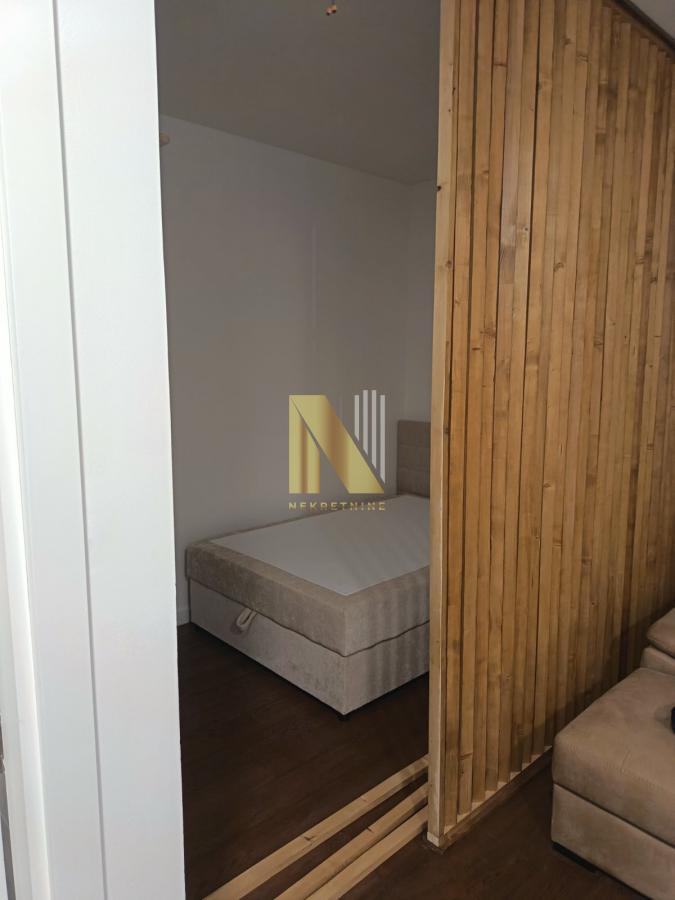 Spavaći deo odvojen od dnevnog boravka drvenim pregradnim zidom.