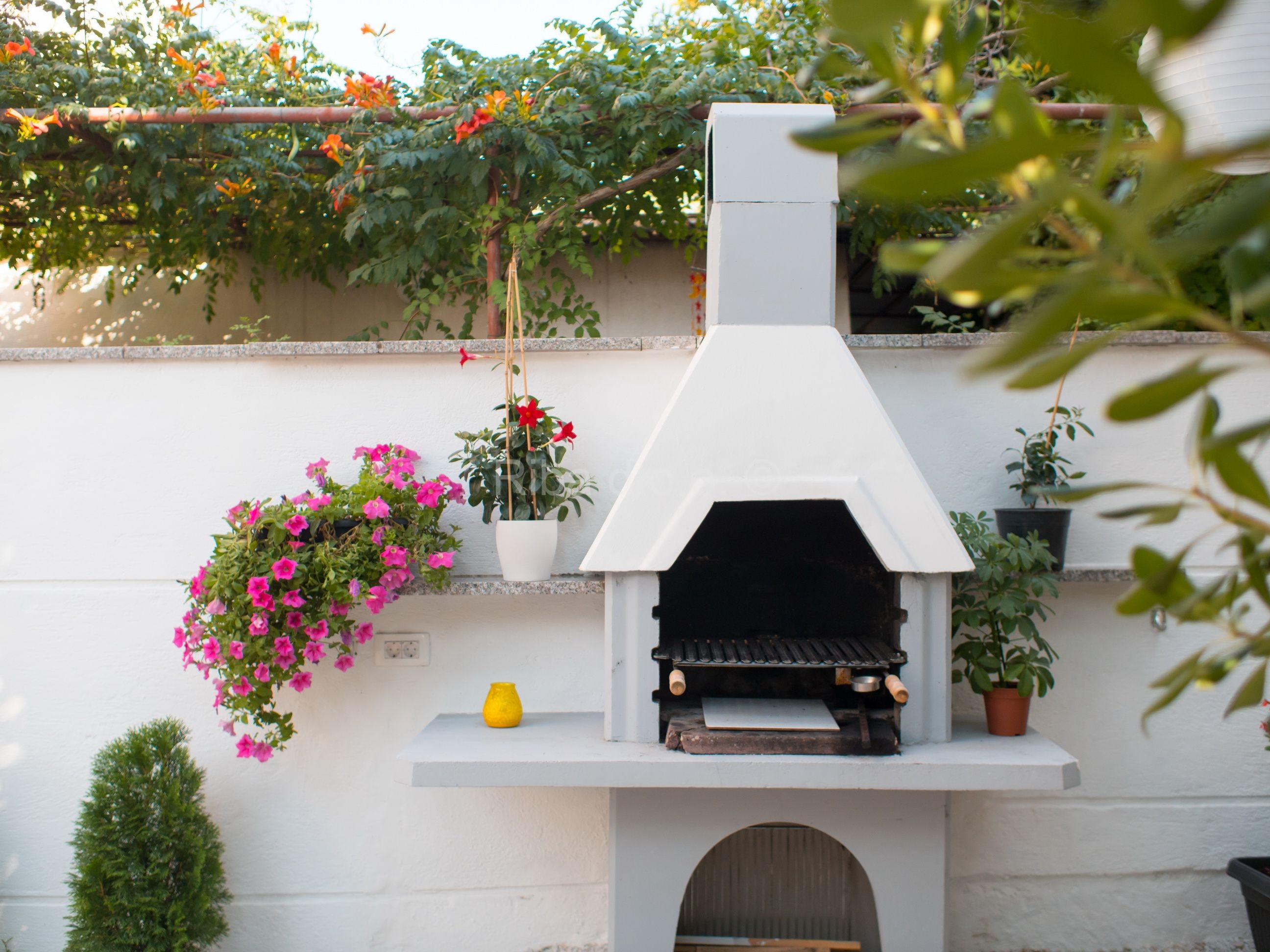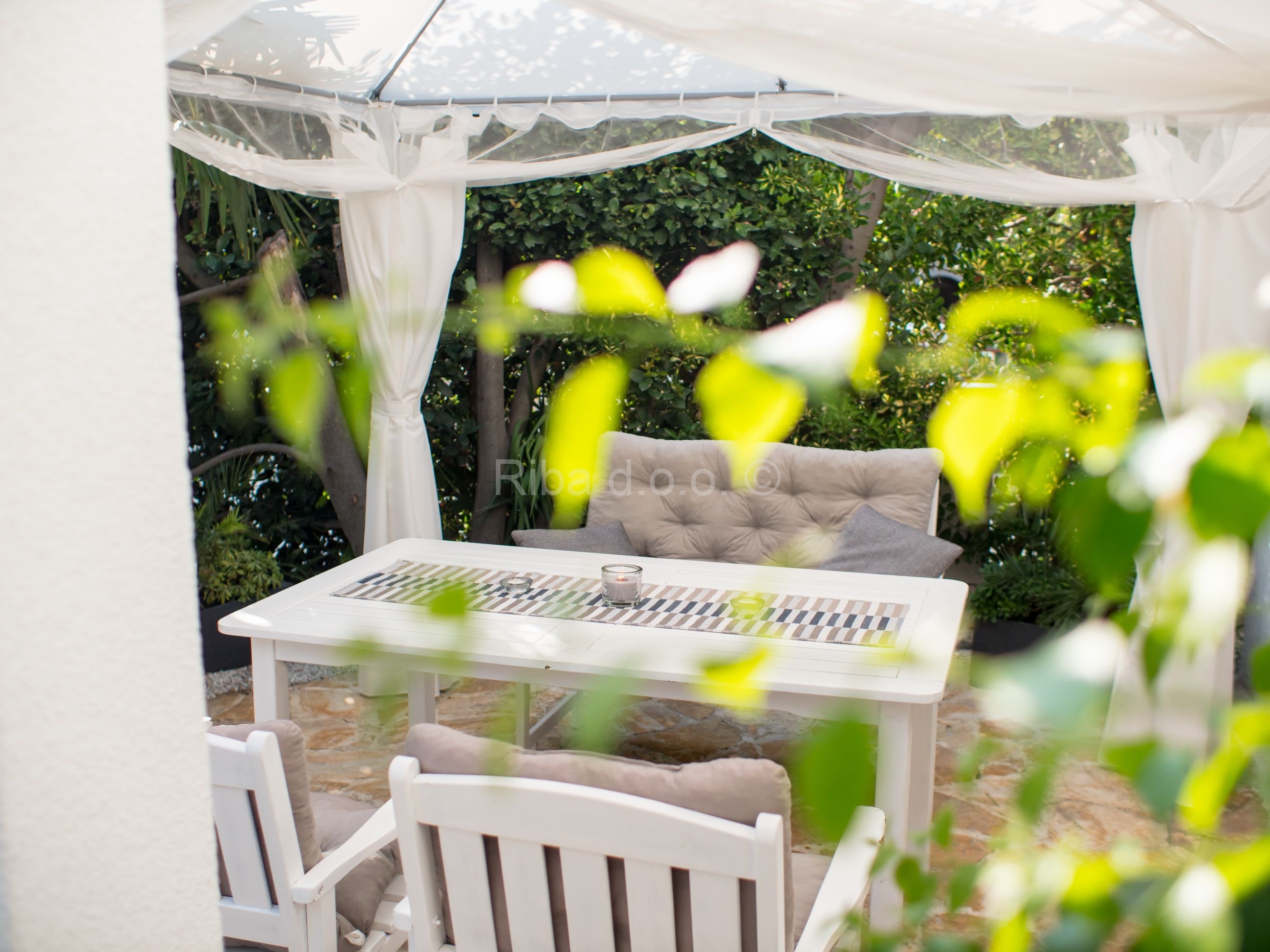 Prizemlje je osmišljeno kao centralni dio kuće s izravnim pristupom prekrasno uređenom dvorištu s velikim blagovaonskim stolom pod sjenicom, ugrađenim roštiljem i bujnim zelenilom (palme, oleandri), što stvara savršenu oazu za druženja.