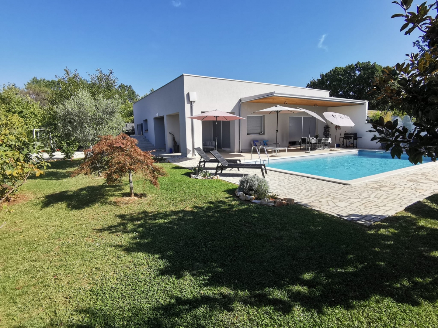 Opis (Engleski): Rovinj, one of Istria’s most coveted coastal gems, is celebrated for its charming old town, pristine waters and vibrant cultural scene—a place where Mediterranean ambiance, natural beauty and modern convenience blend seamlessly. Just beyond the town’s lively core, in a tranquil green setting, a contemporary single-storey semi-detached home with a flat roof, expansive glass surfaces and a private pool is available for sale, offering an inviting retreat for permanent living or restful holidays.The interior spans 140.69 m² and is thoughtfully designed to provide openness, comfort and functionality. The spacious living area integrates a modern kitchen and dining space with a bright lounge that opens directly onto the terrace. Three bedrooms each offer private en-suite bathrooms, complemented by an additional guest toilet, a hallway, a boiler room and a covered outdoor area. With southwest orientation, the home benefits from abundant natural light, and nearly every room enjoys peaceful views of the surrounding greenery....