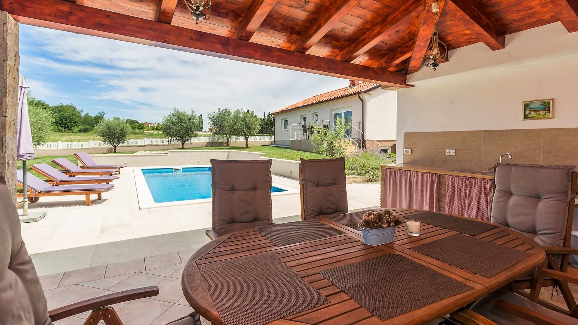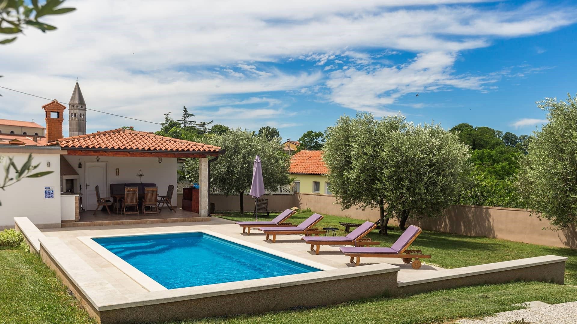 Opis (Engleski): In Poreč, just 7 km from the sea, a beautiful villa with a swimming pool and a spacious yard is for sale. The villa has a living area of 150 m² and sits on a 1,538 m² plot, offering an ideal combination of comfort, privacy, and a Mediterranean lifestyle. This property represents a unique opportunity for anyone searching for a villa in Croatia for sale, a villa in Istria for sale, or a villa in the Poreč area for sale.The villa is set in a quiet area just outside the city of Porec, surrounded by greenery, and includes a 32 m² saltwater swimming pool, a 50 m² garage, and a summer kitchen. The property blends regional architectural style with traditional construction, harmonizing perfectly with the natural slope of the land. The basement, with an area of 50 m², has direct access to the yard, connecting seamlessly with the landscaped garden. This level also includes utility spaces and a social room, while the ground floor houses the living room, kitchen and dining area, three bedrooms, and two bathrooms....