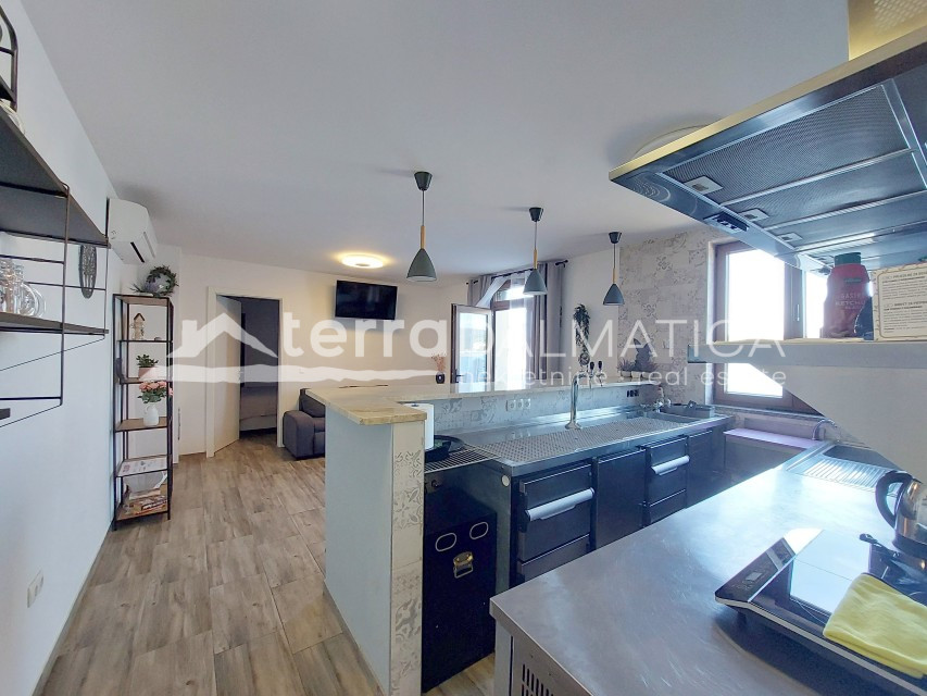 Opis: Prodaje se atraktivan apartman smješten u prvom redu do mora u prekrasnom mjestu Tisno. Apartman se nalazi u prizemlju novije stambene zgrade te ima ukupnu površinu od 48,5 m². Sastoji se od kuhinje, blagovaonice i dnevnog boravka povezanih u jednu funkcionalnu cjelinu, jedne spavaće sobe, odvojene kupaonice i WC-a, kao i dodatne mini kupaonice s WC-om unutar spavaće sobe. Nekretnina se prodaje kompletno namještena, s kvalitetno opremljenom profesionalnom kuhinjom, što je čini idealnom za neposredno korištenje bez dodatnih ulaganja. Posebna vrijednost apartmana je otvoren pogled na more iz svih prostorija, kao i dva zasebna ulaza, što omogućuje jednostavnu prenamjenu u poslovni prostor ili kombinaciju stambene i poslovne namjene. Tisno je prepoznatljivo po svojoj jedinstvenoj lokaciji na spoju kopna i otoka Murtera, s uređenim šetnicama uz more, brojnim plažama i bogatom gastronomskom ponudom, zbog čega predstavlja izuzetno poželjnu destinaciju za život, odmor ili investiciju. Za više informacija i dogovor oko razgledavanja, slobodno kontaktirajte naše agente.