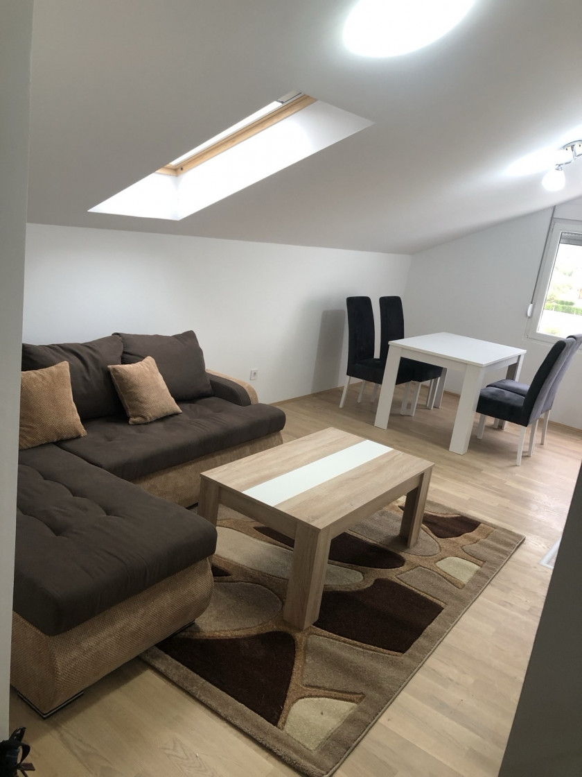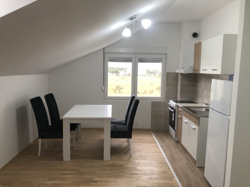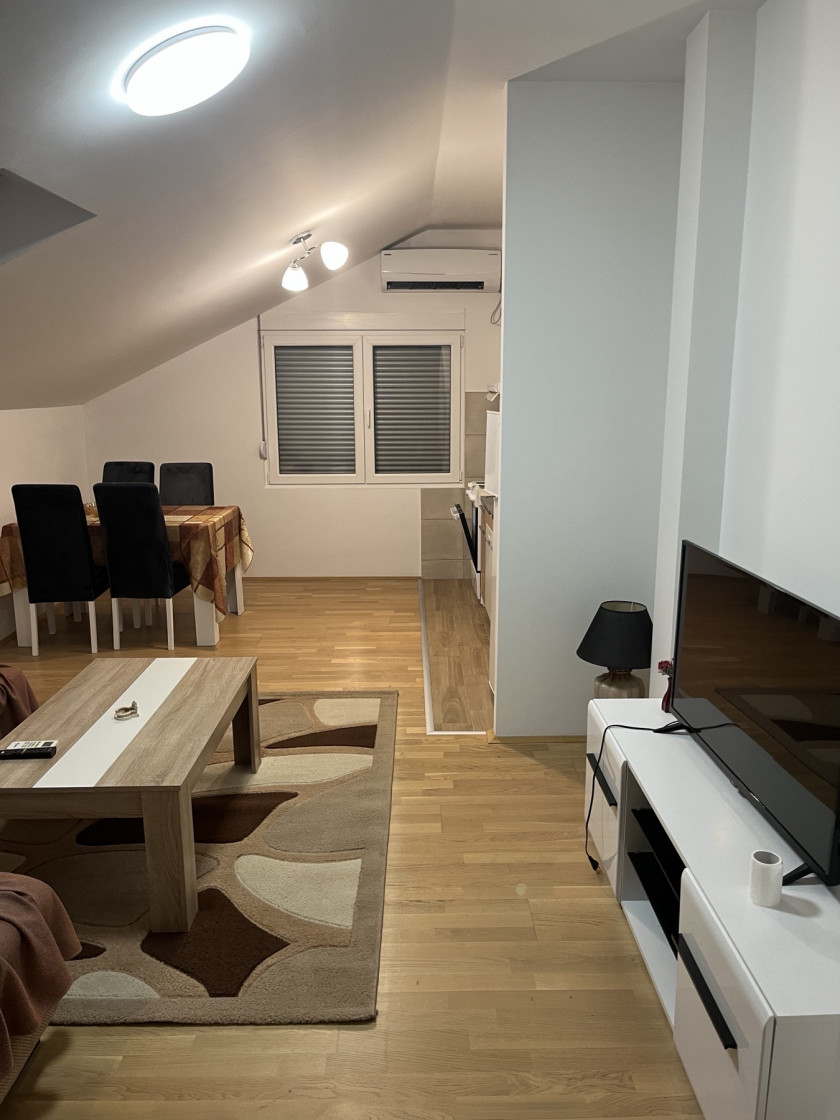 Opis: Iznajmljuje se na duži vremenski period jendosoban namješten stan u blizini Multicoma na Zabjelu. Stan je pozcioniran u potkrovlju manje stambene zgrade koja posjeduje dva sprata. Opremljen je potpuno, posjeduje cjelokupan namještaj koji je dobro očuvan. Sastoji se od: ulaznog hodnika, dnevnog boravka i trpezarije, odvojene kuhinje, spavaće sobe i kupatila. Zgrada se nalazi na dobroj i funkcionalnoj lokaciji koja je povezana sa svim djelovima grada. Zgrada ima privatni parking, a ovom stanu pripada jedno parking mjesto. Pri useljenju daju se kirija i depozit.