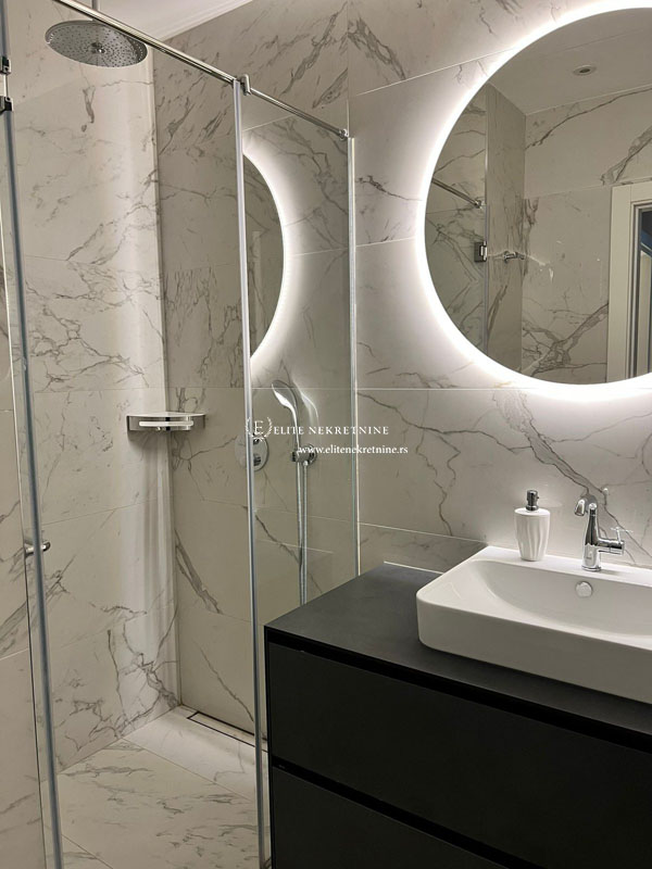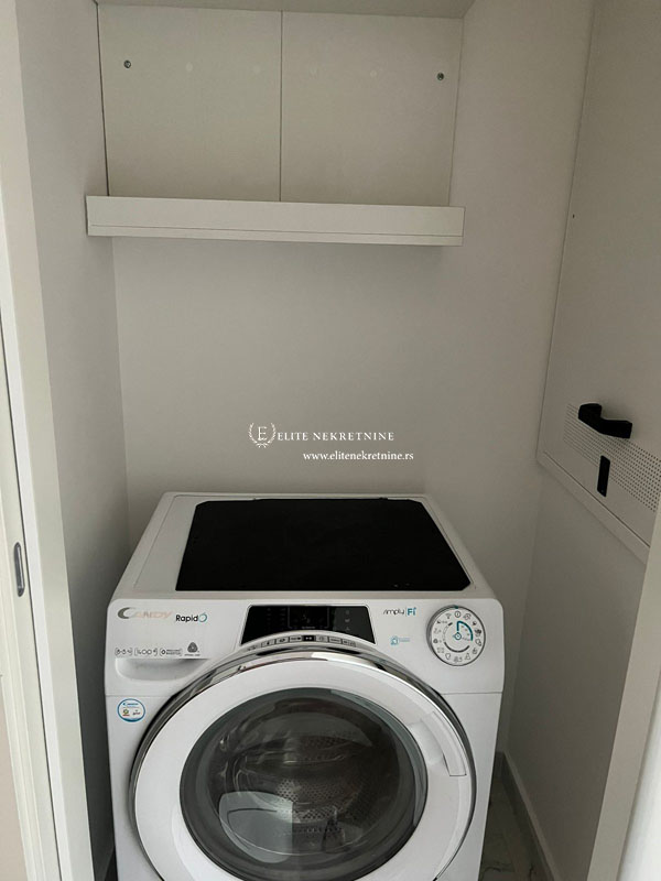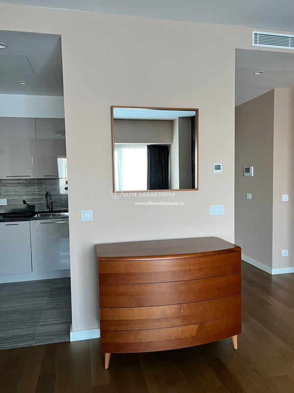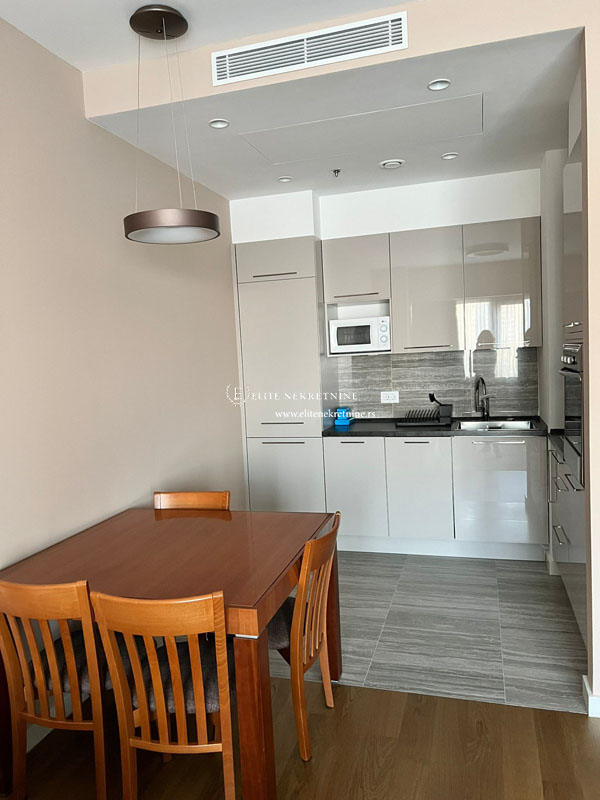 Stan je potpuno opremljen, kvalitetnim nameštajem i tehnikom, vrlo je komforan open space - dnevni boravak sa trpezarijom i kuhinjom, spavaća soba i kupatilo. Zahvaljujući velikim staklenim površinama, obezbeđeno je puno dnevne sunčeve svetlosti.