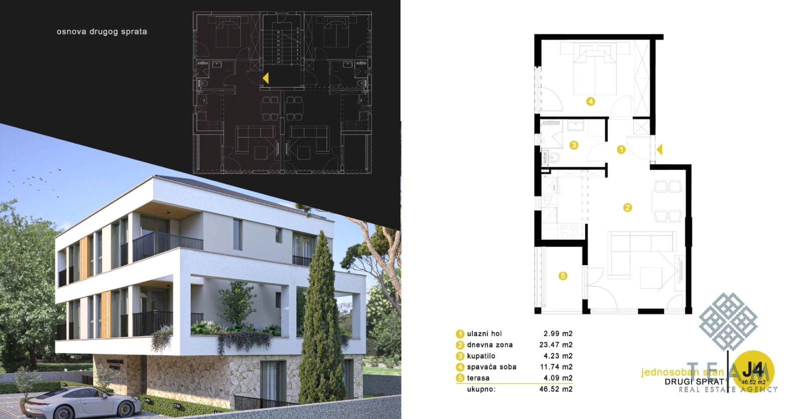 Opis: Na prodaju je jednosoban stan površine 47 m², smješten na drugom spratu objekta u izgradnji u Dalmatinskoj ulici, kod hotela Perla.