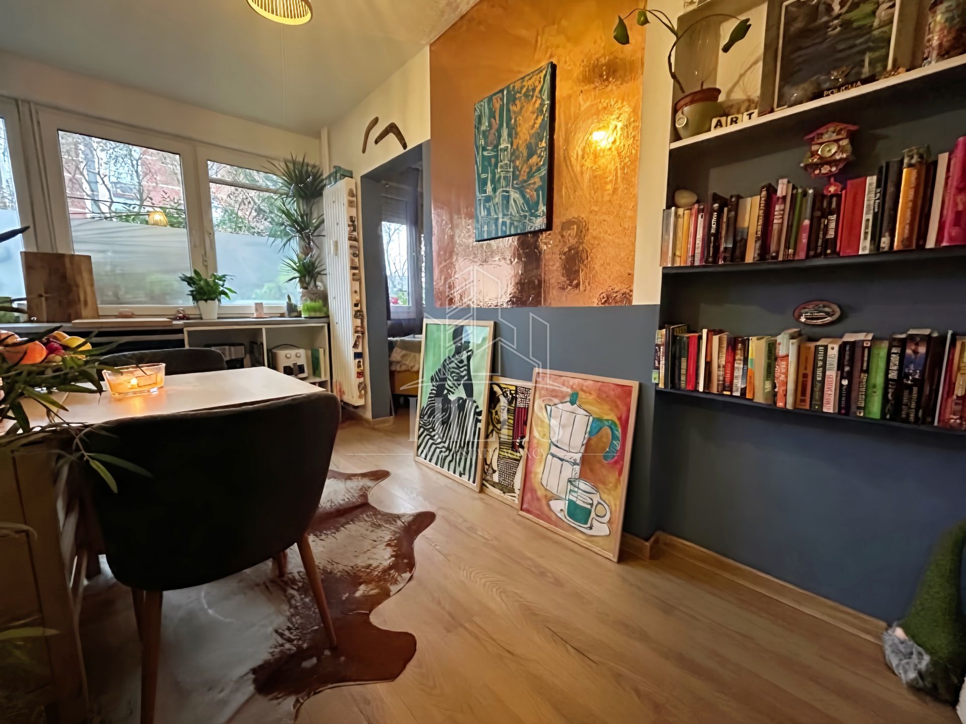Stan se sastoji od dnevnog boravka, blagovaonice, kuhinje, spavaće sobe, kupaonice i hodnika.