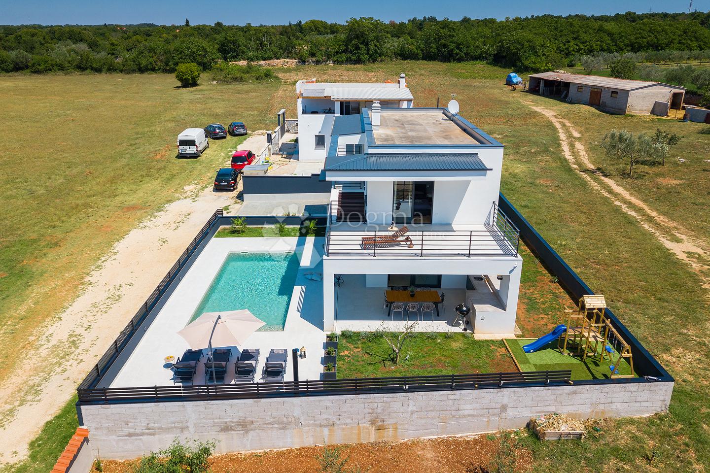Villa se prostire na 135 m2 stambenog prostora koji se prostiru kroz prizemlje i kat te sadrži i 70 m2 terase. Nalazi se u malom romantičnom istarskom mjestu pored gradova Pule i Fažane. Nalazi se na blagoj uzvisni što Vam pruža prekrasan pogled na more od kojeg ste udaljeni svega 5km.