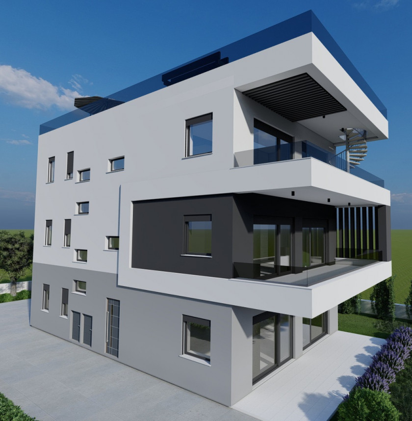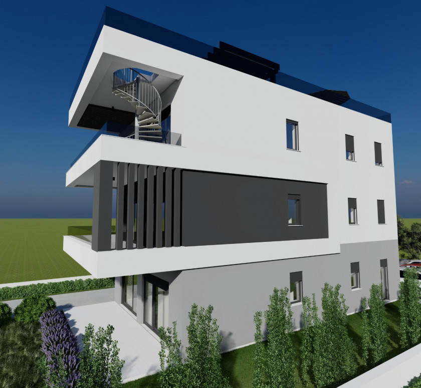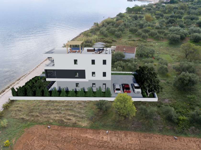 Teren u prvom redu do mora sa pravomoćnom građevinskom dozvolom za izgradnju objekta sa slike. Tri stana po 90m2.