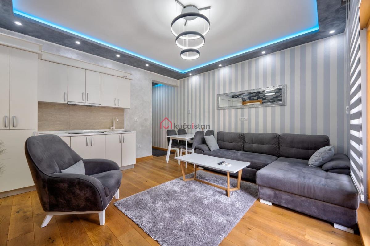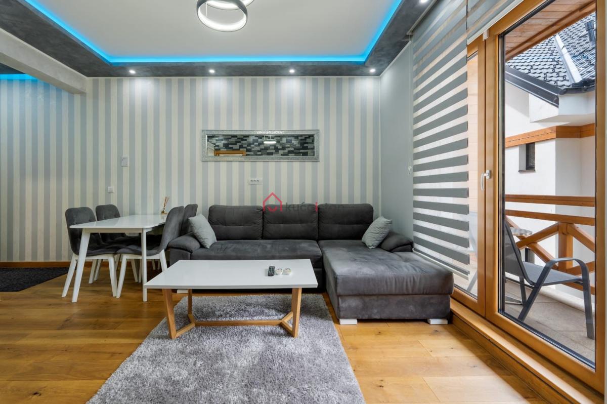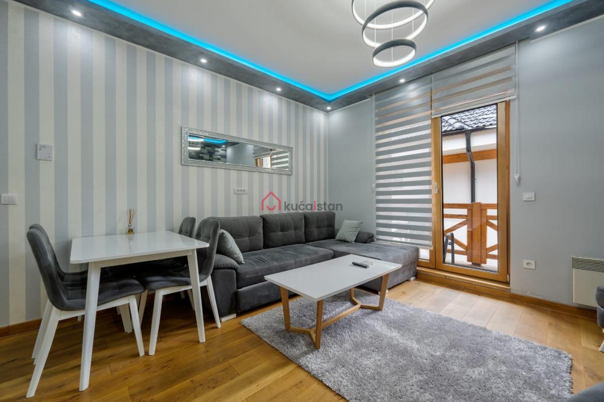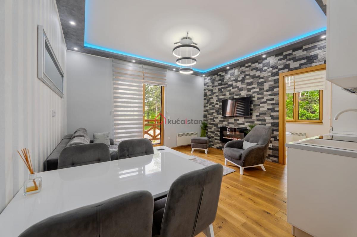 Enterijer urađen i luksuzno namešten, sa posebnim akcentom na udobnost i kvalitet. U dnevnoj sobi nalazi se kamin, koji prostoru daje toplinu i pravi planinski ugođaj. Stan poseduje podno grejanje i norveške radijatore. Sa terase se pruža prijatan pogled na zelenilo, što daje dodatni osećaj privatnosti i mira.