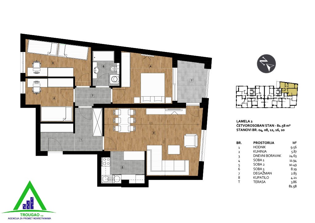 Opis: Prodaje se komforan četvorosoban stan u izgradnji površine 81.58 m² u naselju Rosulje.