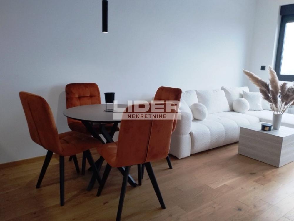 Stan je kompletno opremljen novim namestajem i aparatima za domacinstvo. Stan se sastoji iz predsoblja sa velikim cipelarnikom, modernom kuhinjom sa ugradnim frižiderom, mašinom za sudove, šporetom sa ravnom pločom i suvom ostavom. Trpezarija i dnevni boravak su vrlo prostrani sa ekskluzivnom ugaonom garniturom i televizorom od 65" inča. U spavaćoj sobi se nalazi udobni francuski ležaj dimenzija 160x200 i veliki klizni garderober. Prostrana terasa sa bitan deo ovog stana jer se sa nje pruža prelep pogled na park i deo grada.